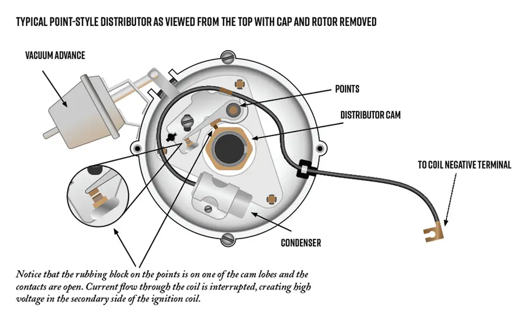 Conversely if the points gap is closed all the time, the circuit never breaks and the ignition coil never has the opportunity release the high voltage charge, and there's no spark.